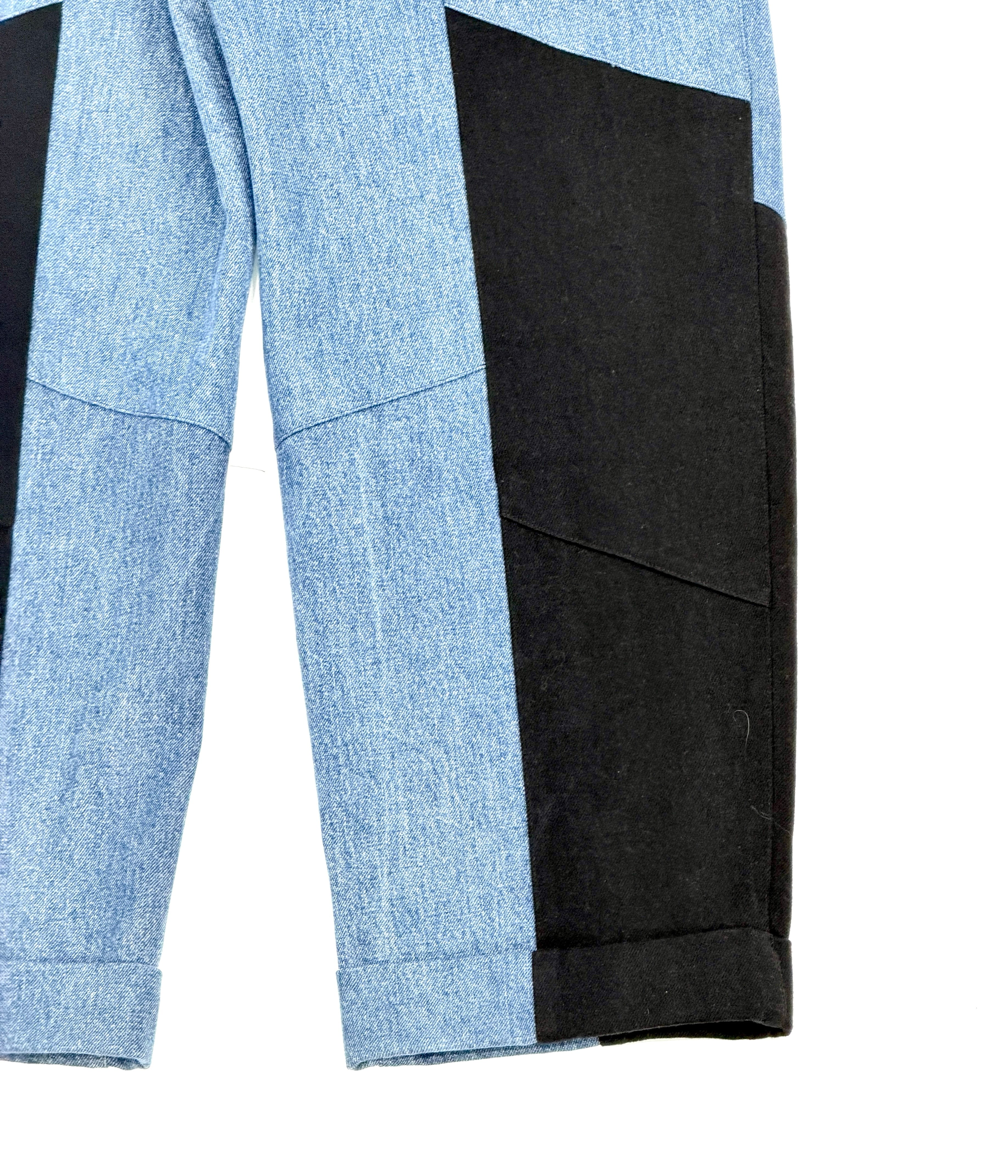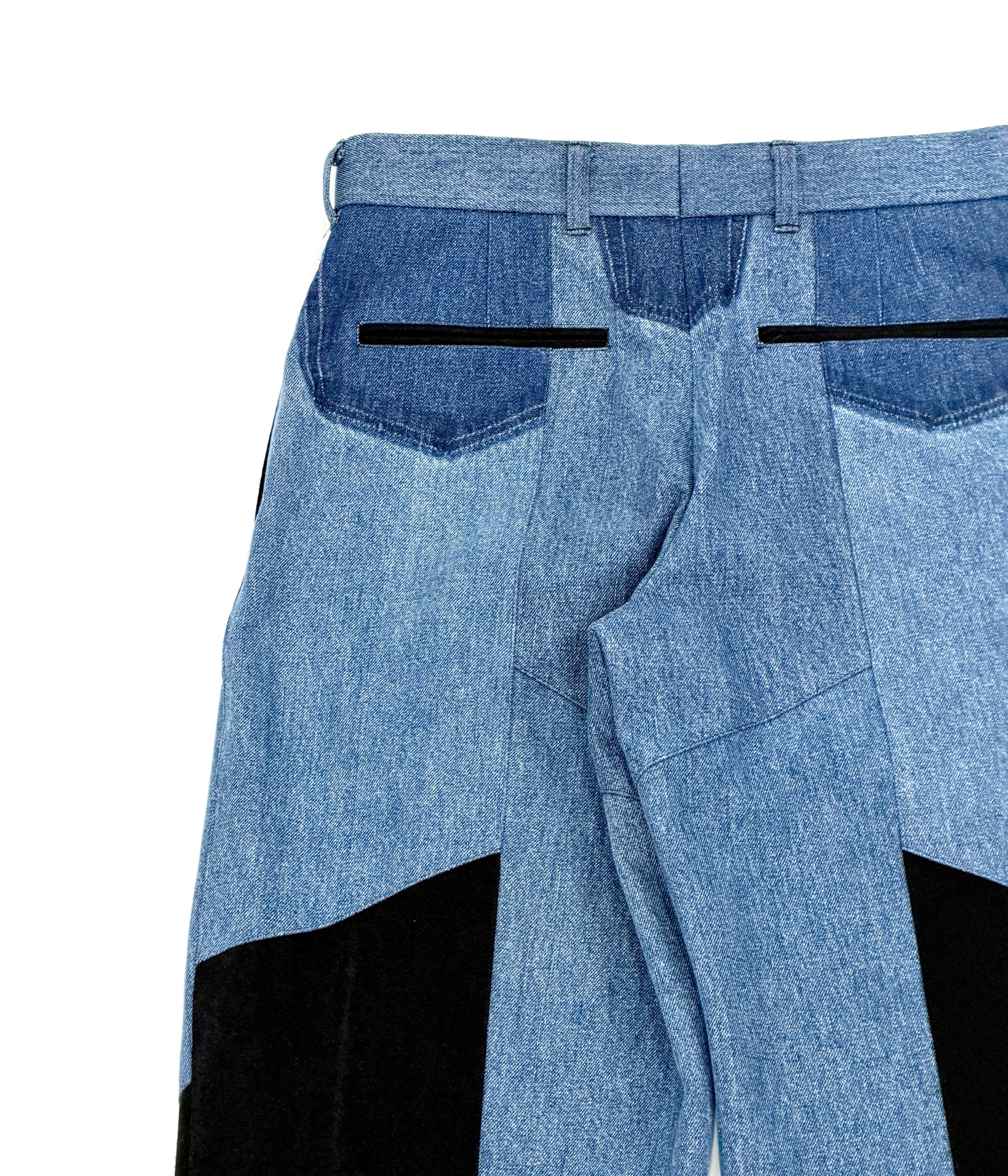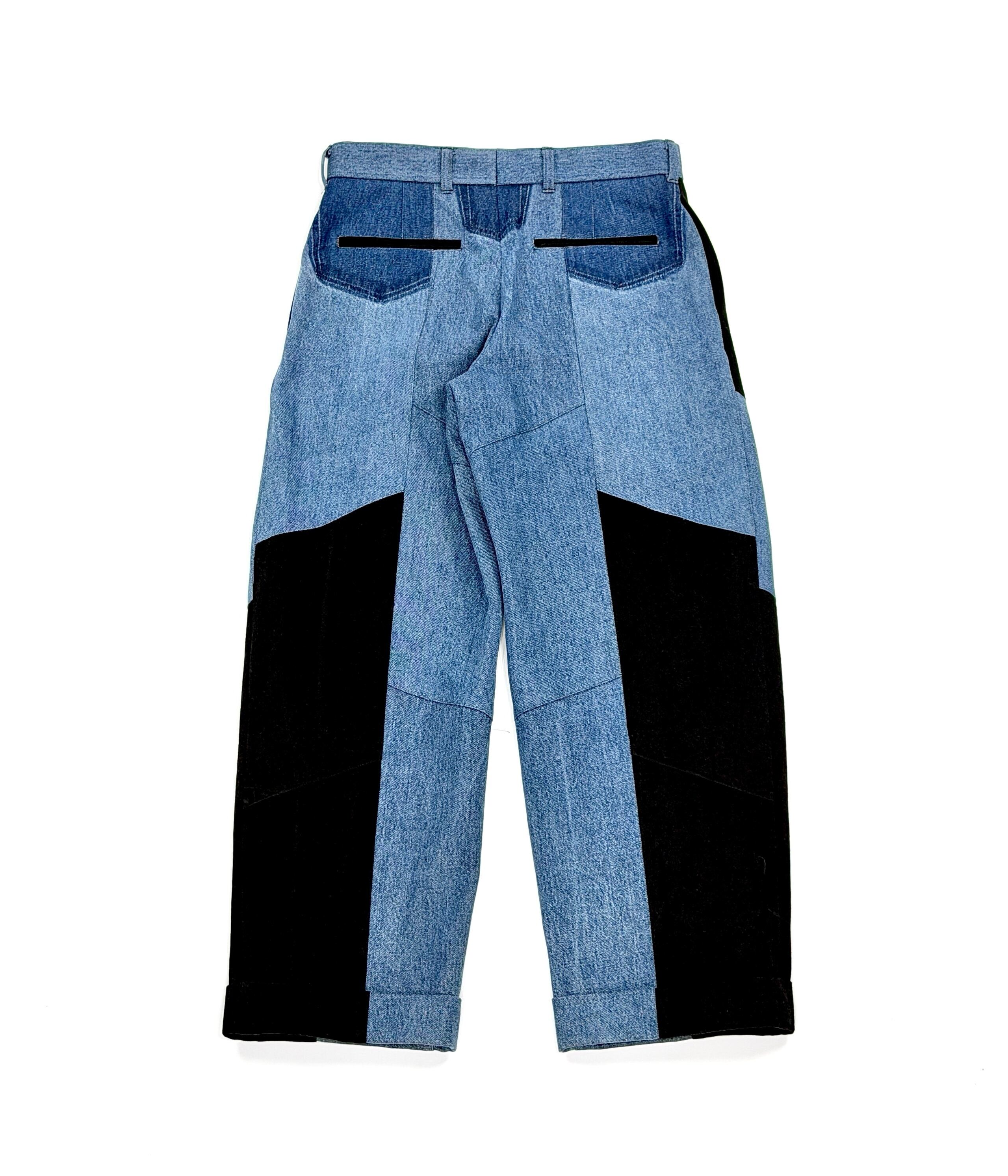 古着の濃色デニムとブラックデニムを組み合わせ、再構築した一本。