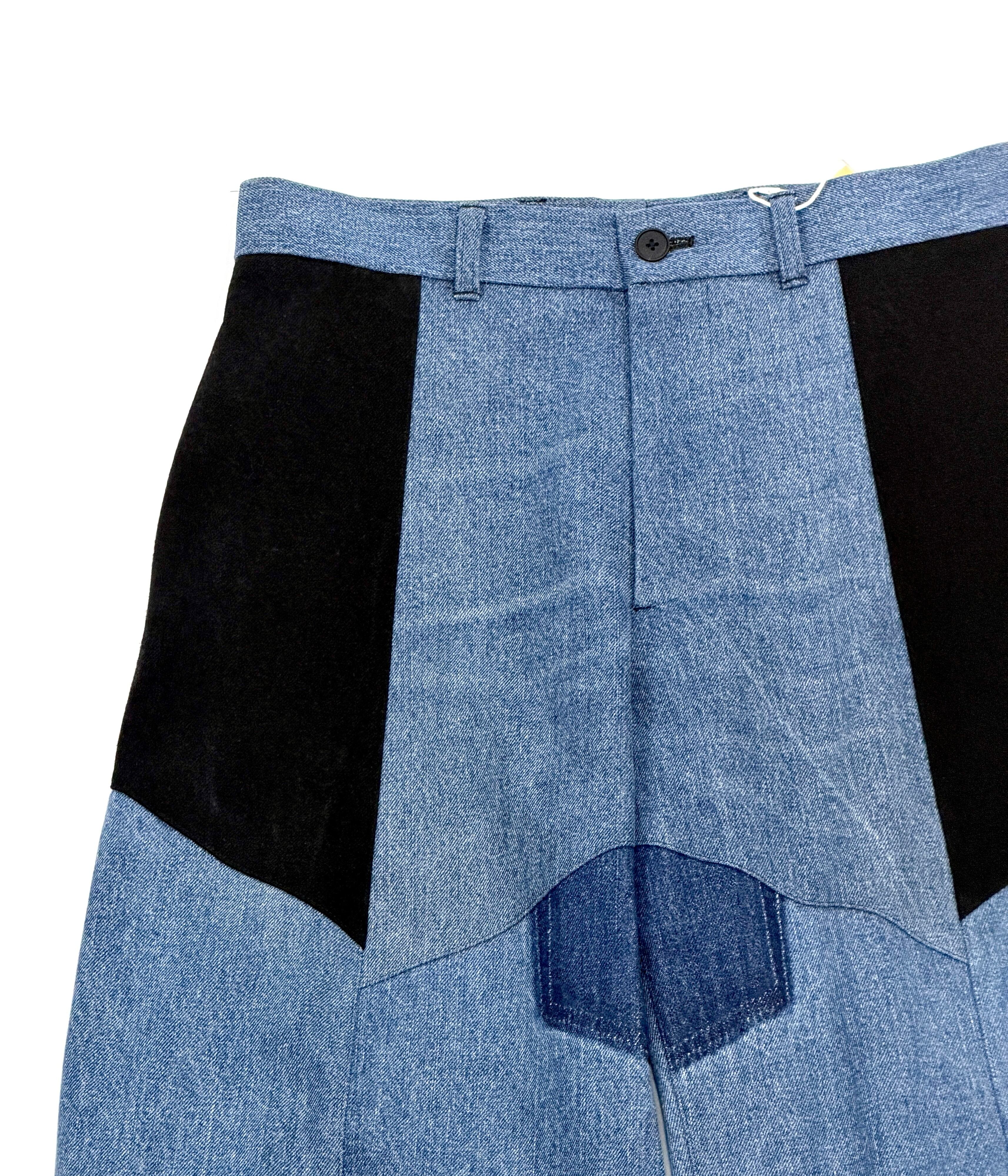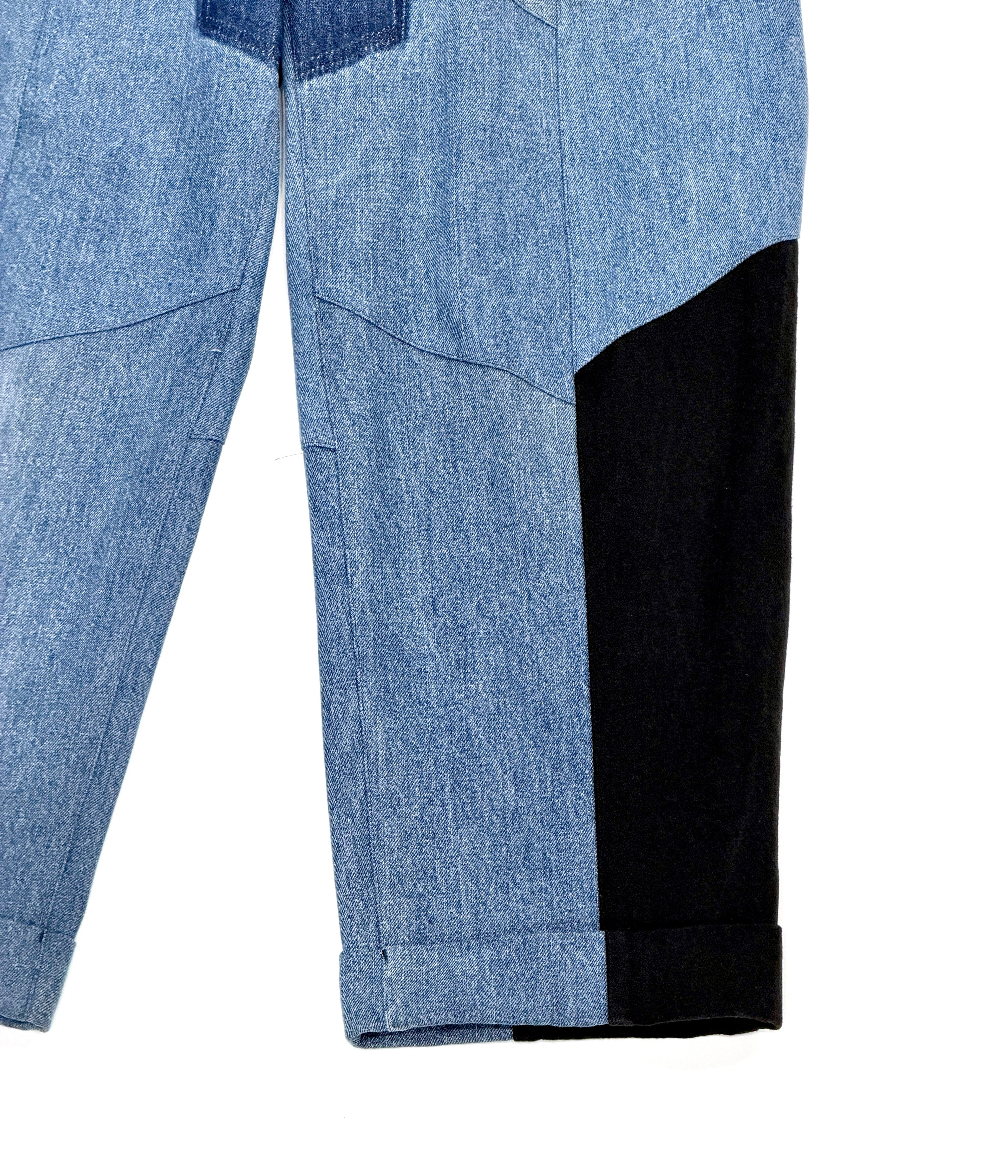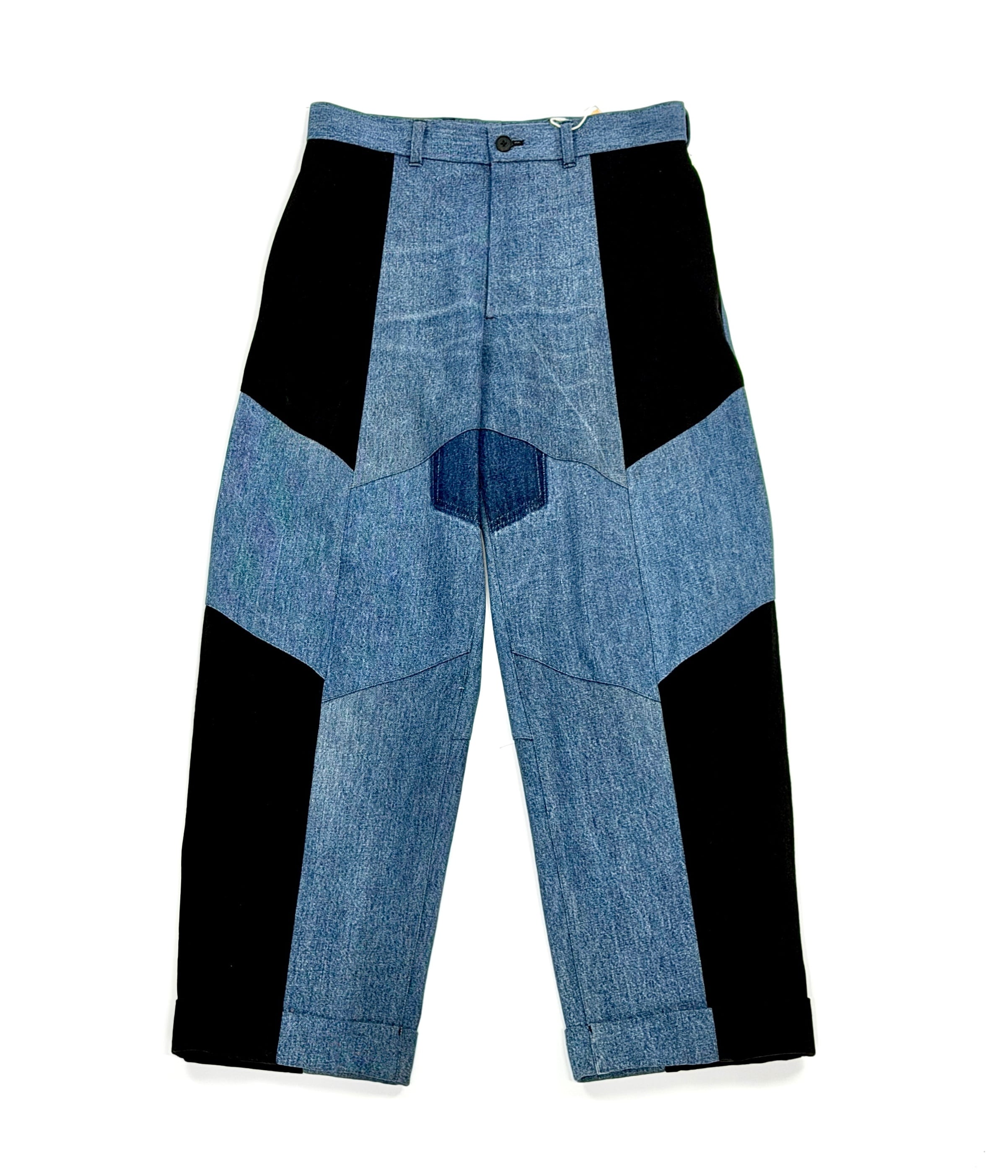 古着の濃色デニムとブラックデニムを組み合わせ、再構築した一本。